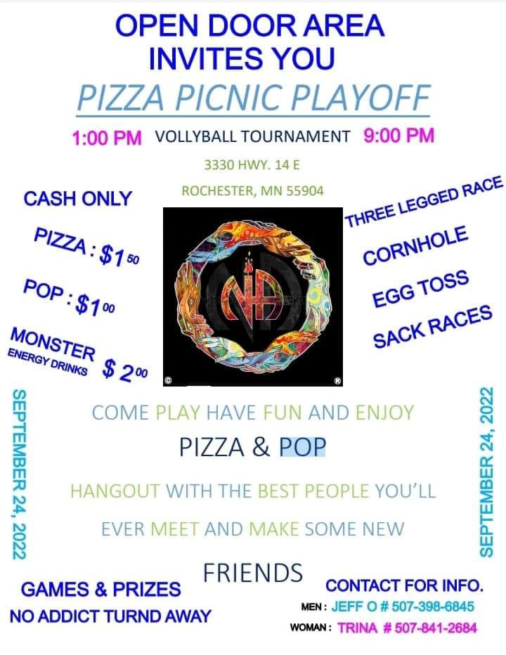 This event has passed. « All Events Pizza Picnic Playoff September 24, 2022 @ 1:00 pm - 9:00 pm « MNRSC Fall Into Recovery TCA 2022 Banquet » Add to calendar Google Calendar iCalendar Outlook 365 Outlook Live Details Date: September 24, 2022 Time: 1:00 pm - 9:00 pm Event Category: Picnic Event Tags:#fun, #opendoorarea, cornhole, picnic, pizza, pop, sackraces Organizer Open Door Venue East Wood Park 3330 US-14 Rochester, minnesota 55904 United States + Google Map