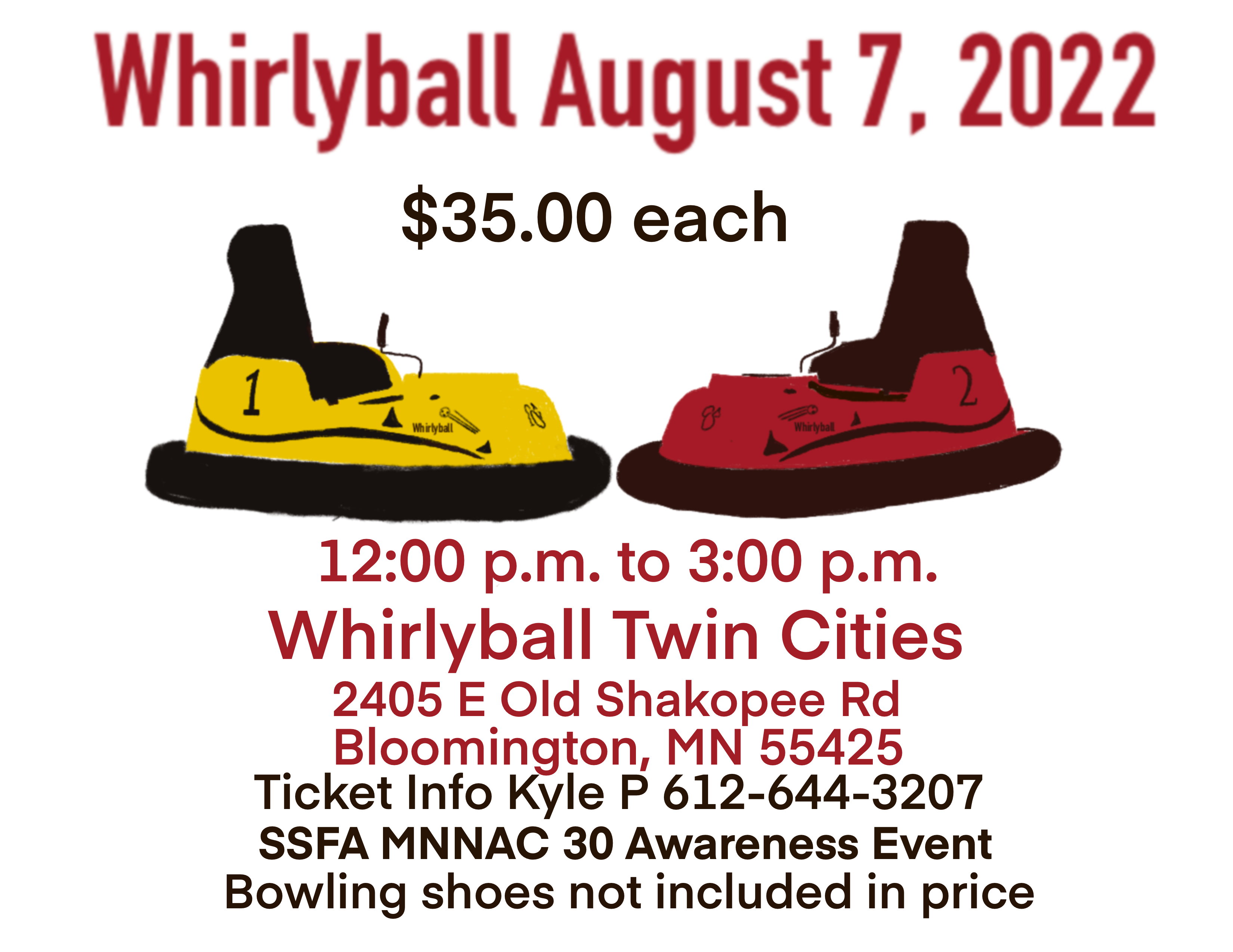 This event has passed. « All Events Whirlyball/Laser Tag/Bowling MNNAC Awareness Event August 7, 2022 @ 12:00 pm - 3:00 pm $35 « Voices In The Valley Campout RITH Summer Campout 2022 » Purchase tickets online: https://checkout.square.site/buy/6EYYOTH3FLJOVUYMXXE5AFQN Add to calendar Google Calendar iCalendar Outlook 365 Outlook Live Details Date: August 7, 2022 Time: 12:00 pm - 3:00 pm Cost: $35 Event Category: Social Event Tags:fundraiser, MNNAC awareness, SSFA Organizer South Suburban Fireside Venue Whirlyball Twin Cities 2405 E Old Shakopee Rd Bloomington, MN 55425 United States + Google Map